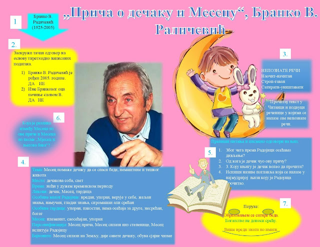 ПРВА АКТИВНОСТ: Преписати о Миловану Данојлићу из лекције "Трешња у цвету" коју смо раније радили. ДРУГА АКТИВНОСТ: На линку који се налази испод одабрати три песме Милована Данојлића, преписати њихове називе и за сваку анписати о чему говори. Поезија Милована Данојлића